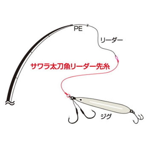サワラ・太刀魚釣りで一番何点であった魚歯によるリーダーカット。これを最大限に防ぎ、かつ遜色なくバイトを誘発させるために、極太透明フロロカーボンにこだわりました。長さは魚へのプレッシャーとスロージャークのような多本バリをセットした場合にもトラブルなく仕様できる30cm長。もちろん初心者の方にも結びやすい強化チューブ。これで巻き込みによるガイド損傷も防いでくれます。号数:リーダー12号