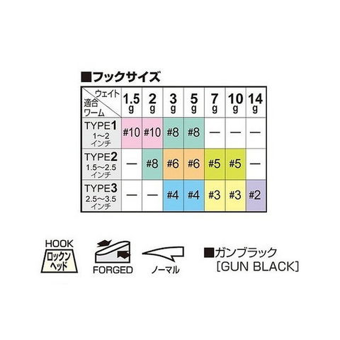 ①ワームサイズ測定メジャー付き②ボトムエリアのロックフィッシュ専用設計。・フックは掛かり優先の細軸仕様。・ヘッドは、ボトムで倒れずしっかりと安定する形状。根掛かり回避、コンタクトノーズ。ボトムで倒れにくく指で持ちやすいヘッド形状。リーダーを通しやすいアイ。極限まで細いキーパー。掛かり優先!細め激鋭フック。