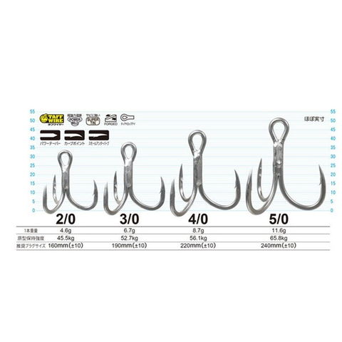 掛かるカーブポイント!!強靭6パワークラスの新型トリプル登場。●高強度タフワイヤー素材。●カン幅をスリム化…フッキング時により広く深くフッキング。クリアランスを広く確保。●強平打ち加工で強度UP。●絶妙なカーブポイント…ストレート先に近いフックアップを実現。●大型魚に負けないパワーポイント…テーパー長を短く高負荷にも耐える大物用ハリ先。●高貫通力バーブ…バーブのサイズを従来よりも小型化。配置位置も従来よりフトコロよりに配置。スムーズに貫通します。サイズ:4/0