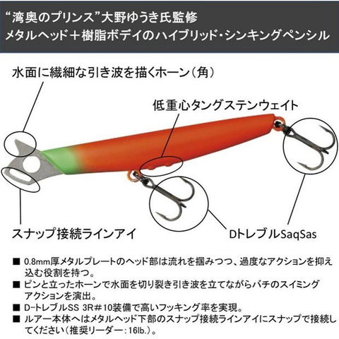 全長:72mm 重量:4.4g 大野ゆうき監修、唯一無二のバチ抜け攻略用メタルヘッドシンペンを大幅にカラーを一新!!●バチが描く極細の芸術的シュプールを再現!紙一重の引き波を演出するメタルヘッドシンペン ●極ホソのV字引き波を出せるメタルヘッド ●メタルヘッド+樹脂ボデイのハイブリッドデザイン ●スローリトリーブではユラユラとテールを揺らすスローなスイングアクション ●Dトレブルサクサス 3R#10装備で高フッキング率を実現※掲載している商品の画像は代表画像を表示しています。また実物と色が違って見える場合があります。あらかじめご了承下さい。