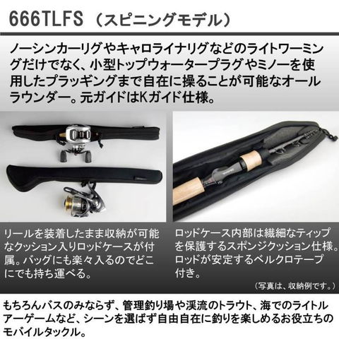 標準全長ft.(m) 6'6"(1.98) 継数 (本) 6 仕舞 (cm) 42 標準自重 (g) 120 先径 (mm) 1.4 元径 (mm) 11.9 ルアー重量 (g) 0.8-5 ナイロン ライン(lb.) 2-5 カーボン含有率 (%) 96 フィッシングを特別なアクティビティとしてではなく、普段のスタイルの延長線上で楽しみたいというアングラーに最適。「B.B.B.(トリプルビー)」は本格的なバサーの要求にも応える専用設計のテレスコピック(振出)ロッド。バスフィッシングを主眼に置きつつ、管理釣り場や渓流、海でのライトゲームなど、シーンを選ばず高いパフォーマンスを発揮する本格派仕様。 ■666TLFSノーシンカーリグやキャロライナリグなどのライトワーミングだけでなく、小型トップウォータープラグやミノーを使用したプラッギングまで自在に操ることが可能なオールラウンダー。元ガイドはKガイド仕様。