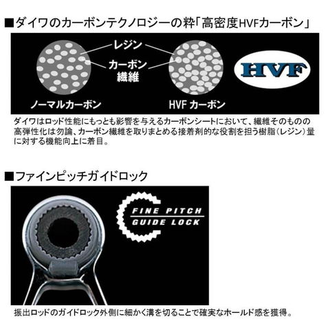 標準 全長 (m) 4.5 継数 (本) 5 仕舞 (cm) 104 標準 自重 (g) 445 先径 (mm) 2.1 元径 (mm) 24.7 錘負荷 (号) 23~30 リール シート位置 (cm) 59 カーボン含有率 (%) 92 投げ釣りの醍醐味を十分に味わえる本格仕様。本格的な投げ釣りが体感できる一竿。振出投竿に求められる張りと粘り、機動性や携行性等を追求。堤防、砂浜からのキス・カレイ釣りから急流の大物まで幅広いステージで投げ釣りの醍醐味が味わえる。長尺の450ローシート仕様を初め、あらゆるシチュエーションと釣り人の飽くなき探究心とモチベーションに応えるラインナップ。ダイワのカーボンテクノロジーの粋「高密度HVFカーボン」ダイワはロッド性能にもっとも影響を与えるカーボンシートにおいて、繊維そのものの高弾性化は勿論、カーボン繊維を取りまとめる接着剤的な役割を担う樹脂(レジン)量に対する機能向上に着目。贅肉ともいえるレジンの量を減らし、筋肉となるカーボン繊維の密度を高めることで、より強く、より軽く、より細いロッドの開発を進めている。HVFはノーマルカーボンに対し更にレジン量を減してカーボン繊維を密入する事で、軽さとパワーを高いレベルで実現し高度なパフォーマンスを発揮する。ファインピッチガイドロック振出ロッドのガイドロック外側に細かく溝を切ることで確実なホールド感を獲得。フルキャスト時のガイド回りやガイド抜けを防止する。さらにバイアス構造のため、ロッド本体の曲がりに支障をきたすことはない。
