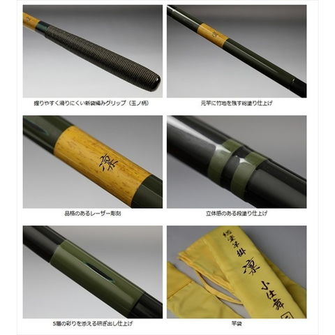 標準全長 (m) 2.2 継数 (本) 3 仕舞 (cm) 115 標準自重 (g) 210 竿受/弓受 (mm) 7.5 / 12.0 漆黒の本体色に緑の段塗りを施し、そこに見える研ぎ出しが味わい深い趣を生んでいる。竿掛は4通りの組み合わせで幅広く対応。