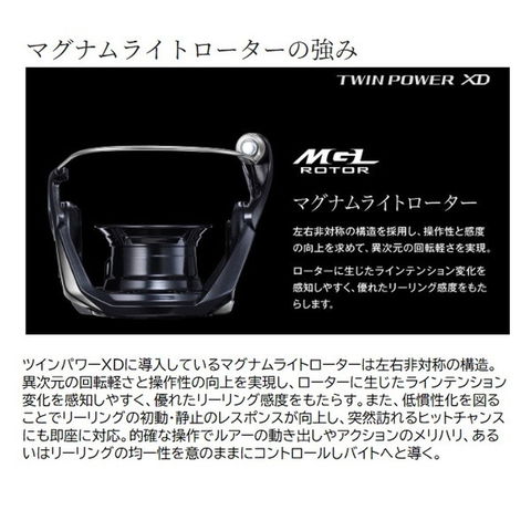 カーボン繊維強化樹脂CI4+製の低慣性ローターによる軽快さとレスポンスを生かし、テクニカルな釣りに真価を発揮するマグナムライトシリーズ。ツインパワーXDはそのなかでも強さにフォーカスした剛健な仕様が特徴。■4000HG・・・#4000サイズのスタンダードハイギアモデル。遅すぎず、速すぎないちょうどいい巻取り速度で、幅広い釣種に使える汎用性の高いモデルです。重量(g):245