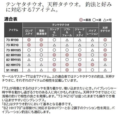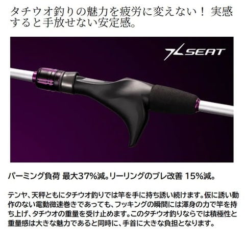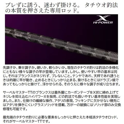 に今や全国区の人気ターゲットであるタチウオ。釣法の多様化、地域の広がりはタックルが細分化し、適した竿が分かりにくくなりかねないもの。そこでシマノは最先端のタチウオシーンで必要とされている要素を適材適所に採用、実戦向きのコストパフォーマンスに優れるロッド、サーベルマスターTTを開発。■73 M210・・・喰わせ7:3調子。タチウオの小さなアタリを目感度で大きく表現。電動巻き誘いにおいてタチウオのアタリを弾かずに喰い込ませる7:3調子アイテムです。 ★ 全長:2.10m 継ぎ方式:並継 継数:2 仕舞寸法:108.9cm 自重:133g 先径:1.2mm テンヤ号数:30-60号 錘負荷:20-80号 リールシート位置:416 リールシートタイプ:DOWNLOCK カーボン含有率:89.7%