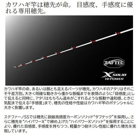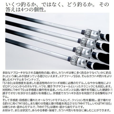極限まで研ぎ澄まされた感覚の世界で魚と向き合う極限遊戯。そんなカワハギとの真剣勝負に対し、シマノの技術の粋を注ぎこんできたブランド「ステファーノ」。■HH170-2・・・手感度と操作性を追求したHHモデルはハイレスポンスな誘い操作を可能にした硬調9:1調子に仕上げました。錘を浮かせた宙釣りを得意とし、手感度でカワハギか否かを判別できる攻撃的なアイテムです。 ★ 全長:1.70m 継ぎ方式:並継 継数:2 仕舞寸法:89.5cm 自重:73g 先径:1.0mm 錘負荷:20-40号 リールシート位置:297mm リールシートタイプ:DOWNLOCK カーボン含有率:99.2%