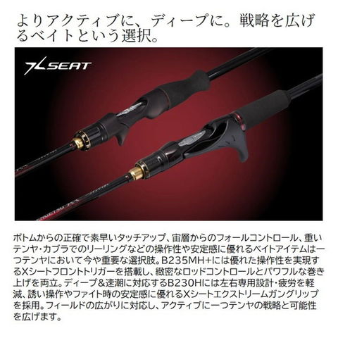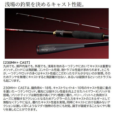 一つテンヤに求められる操作性と感度を高次元で追求した先進の軽量ハイスペックモデル。シマノ先進ロッドテクノロジーを注入、一つテンヤに求められる操作性と感度を徹底追求したハイスペックモデル。穂先には強度に優れたタフテック∞を採用し、微細なアタリを感知する超繊細高感度を追求、タイムラグなく掛けるレスポンスと遊動テンヤによるナチュラルな喰い込み性能を両立。■230MH+ CAST・・・シャローエリアを広範囲に攻めるキャストアイテム。耐ネジレ性能を向上させたハイパワーXソリッド穂先からベリーへとスムーズにつながるアクションは、キャスト性能とアタリ感度に優れ、シャローエリアを広範囲に攻略できるキャストアイテム。
