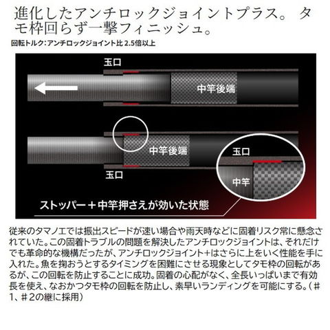 より早く、より確実に。ランディングの革命は止まらない。固着を防ぐだけでなく、タモ枠の回転までも防止するアンチロックジョイント+を搭載。従来のタマノエでは不可能であったタモ枠の回転と固着を同時に抑制できる機構へ進化。さらに、エアーアシスト尻栓と組み合わせることですばやい振出性能はそのままに、フィニッシュの精度を大幅に向上。要となるブランクスにはスパイラルXコアを採用し、風やサラシを裂くような鋭い操作性で、悪条件下でも確実な獲り込みを頼もしくアシスト。シビアなトーナメントシーンから生涯の記憶に残る魚まで、あらたな相棒が磯の夢を叶える。■750・・・磯の釣り座を広げる可能性を秘めた、シリーズで最長のレングス。通常のタマノエではハリを失い、ランディング性能が著しく低下する面を解消しているため、高場でのフィニッシュシーンを力強くサポート。全長:7.5m