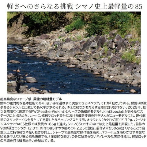 ニュースタンダード「85」レングスでシマノ史上最軽量ロッドが登場。新基軸として注目高める85レングスにおいてシマノ史上最軽量ロッドが登場。歴史を塗り替えてきたライトスペシャルが新たに85になることで自重以上に持ち軽さ&振り軽さUP、風抵抗も減少。全体はシャープに。その軽さは超高精度の操作を可能にする。軽量ロッドながら胴がブレず泳がせ上方操作が得意。薄肉化したロッドは、ツブレやすく、華奢さやパワー不足が生じるもの。しかしスパイラルXコア+設計の進化により、そのデメリットを打破。持った瞬間、振った瞬間に感じるその軽さとシャープネスな性能を体感したとき、友釣りの新たな世界が切り開かれる。 ★ 全長:8.5m