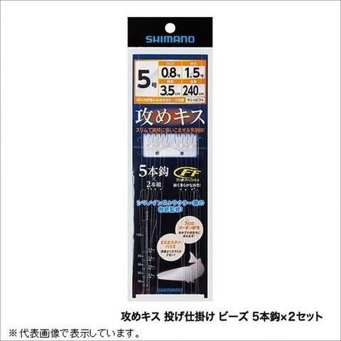鈎(号):4号 砂ズリ(cm):120 幹糸(号):1.5 ハリス(号):0.8 枝長さ(cm):3 枝間(cm):30 全長(cm):180 素材/ハリ:鋼 ハリス:EXエステル 幹糸、砂ズリ:フロロカーボン 攻めキス 投げ仕掛け ビーズ 5本鈎×2セット:RG-NS3N。「初心者からベテランまで満足できる仕掛け」を追求しました。ビギナーにも多点鈎仕掛けを使って頂けるよう、「トラブルレス」を第一に、少し硬めのモトスを採用。良型キスが数点掛かっても絡みにくい仕様になっています。装飾に関しては、「攻めキス」「掛けキス」共、ハリス部分にゴールド&パールホワイトビーズを交互に施した仕様と、グロー留&ケイムラ留を交互に施した2アイテムを設定。晴天時や海水が澄んでいる状況の時には前者、朝夕マズメや曇天時には後者というような使い分けが出来ます。両鈎共、4号~6号サイズ、3本・5本・8本の設定で、釣れるキスのサイズや状況で使い分けが出来るようなラインナップになっています。 ※掲載している商品の画像は代表画像を表示しています。また実物と色が違って見える場合があります。あらかじめご了承下さい。