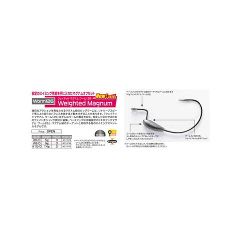 サイズ:#8/0、重さ:9g、3個入 ★ 強烈なアクションを発生させるマグナム級のビックワームは、リトリーブスピード等により自らのバランスを崩すほど動きすぎることがあります。「ウェイテッドマグナムワーム126」はそんなワームの暴走をおさえ、安定して泳がせるためのウエイトをシャンク部分に装備。ベースフックは太軸設計の「キロフックマグナムワーム26」。マグナム級のターゲットと対峙するためのスイミングスペシャルモデルです。