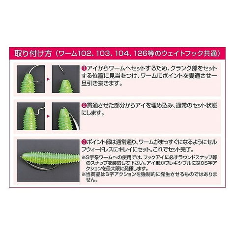 生命感に満ちたリアルスイミングを演出。フロントバランスウェイト。ややロールを抑えるスイミングバランスと前のめりなフォール姿勢が、ベイトフィッシュに近いリアルスイミングアクションへと導く、フロントバランス仕様のチューンドフックです。高比重ストレートワームやS字系ソフトベイトまで、様々なワームに生命感を吹き込み、ストレートリトリーブでのスイミング&フォール、ズル引き等でニュートラルフィッシュに口を使わせます。更に、フロント側に位置するウェイトがワームのズレを防ぎ、ワームストッパーとしての役割も果たすため、高比重及び自重のあるワームへの使用にもズレを気にすることなく、セカンドバイトも拾える扱いやすい設定となっています。