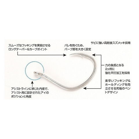 「パイク」の性能を継承しつつ、管付でパワーアップ。「パイク AS-03」の理想のアシストフック形状をそのままに、ワイヤー径をUP、ライトジギング用のみならず、パワージギングにも対応する、よりパワースペックなアシストフックにもそのレスポンスを反映させる管付仕様としました。ベント部へは強化平打加工を施し、更なるホールディングパワーを確保。計算された角度のアップアイ仕様により、アシストラインがスムーズなフッキングへと導きます。
