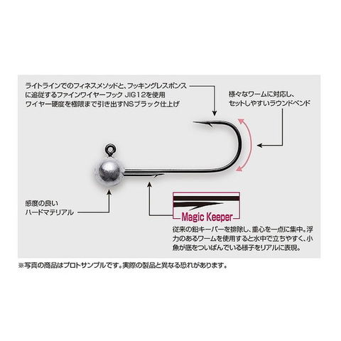 ワームの性能を極限まで引き出す、フィネスジグヘッド。細みのワームをセットしてもシルエットを崩しにくく、ポテンシャルを最大限発揮するバーブキーパー(Magic Keeper)が特徴。キーパー部にウェイトを使用せず重心がヘッド一点に集中し、ボトムでエサをついばむ小魚をリアルに演出したり、もちろんシェイクリトリーブでのミドスト等にも使用可能。ライトラインを用いたフィネスメソッド用ジグヘッドのスタンダードモデルです。●ワームのシルエットを損ないにくく、ズレを軽減するマジックキーパー採用。●ワームがセットしやすいラウンドベンドタイプのファインフック採用。●フックのポイント&硬度を引き出すNSブラック仕上げ。