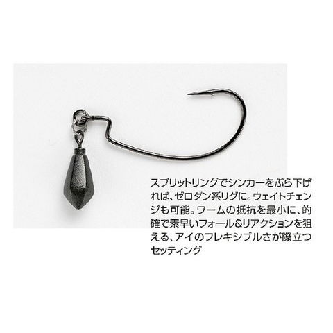 ワームが躍る。リングドオフセット。絶対的信頼のオフセットフック「Kgフック」をベースに、高強度なリングを装着。リングにラインを結ぶことでフックの自由度が増し、上下のアクションにこれまでに無いしなやかさをもたらします。クロー系ワームをメインとしたボトムでの倒れ込みアクションや、特にテキダンリグとの相性は抜群!小刻みなシェイクにしっかり追従し、ワームアクションを生かす抜群の組み合わせです。その他、「DS-6」や「DS-8」等のドロップシンカーをスプリットリングで装着することで簡易的にゼロダンリグも作成可能。