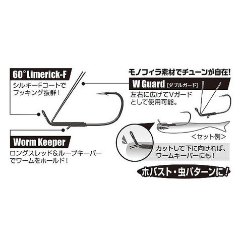 ストラクチャーをタイトに攻める!ガード付フィネスフック。表層~中層をサスペンドに近い超スロースピードで誘い、タフな魚にも口を使わせる驚異のメソッド「ホバーストローリング」に対応する特殊形フックです。最大の特徴であるWガードは、カバーやオーバーハング等のストラクチャーへのタイトなアプローチを可能にし、これまで攻めきれなかったポイントへ使用範囲が拡大。広げたりカットしたりと調整が自在で、シチュエーションに合わせたチューンが可能。その特徴はホバストのみならず、主に夏の季節に有効な「虫パターン」にも対応。ガードを生かしたちょうちん釣り(吊るし)等のテクニックや、カバー絡みで高いポテンシャルを発揮。2021年、大小の新サイズを追加し、さらに幅広いワームで使用可能に。