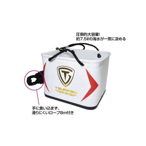一気に大量汲み上げ!全てにおいて便利な大容量モデル。●全てのシーンで違い歴然!最大約7.5リットルを一度に汲み上げ可能。●堅牢性抜群!底面強化加工によりハードな磯でも安心●使いやすさが違う!ロープ部に内蔵されたウエイトにより着水後は素早く水が汲める!サイズ:205mm×245mm×185mm