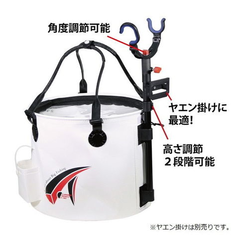 サイドに竿立て用ポール付のアジバケツ。補強プレート付で型崩れしにくい。40cmはポンプポケット2コ付。サイズ:40cm