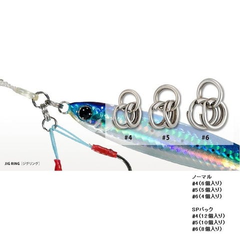 #4 6個 オフショアジギングでリーダー、メタルジグ、アシストフックの接続に便利なジグリング。比較的ライン撚れの少ないベイトタックルに最適です。高強度の溶接リングにハイテンションステンレスバネ材を使用したスプリットリングを2個取付けた仕様です。写真のようにリーダーを溶接リングに、片方のスプリットリングにメタルジグ、もう片方のリングにアシストフックを接続します。メタルジグ、アシストフックを別ーのリングに取付けることでファイト中、魚の力がメタルジグに伝わり難い構造なので、魚のバレを軽減します。