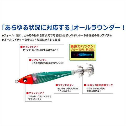 サイズ:20号(75g) ブルー夜光の発光を抑えてシルエットでアピールする定番カラー。( 発光ピーク波長:488nm) ダイレクトにアクションを伝達するアイ フラッシングアピールするフラッシュアイ イカの視覚にも訴えるリアルヘッド 使いやすいシンプルなラウンドボディ ツツイカの細い足も確実に掛ける14本●2段の段差フック「あらゆる状況に対応する」オールラウンダーメタルスッテ!●フォール、誘い、止めるの動作を高次元で可能にした扱いやすいトータル性能の高いアイテム●オールマイティーなラウンド形状は水キレも良好