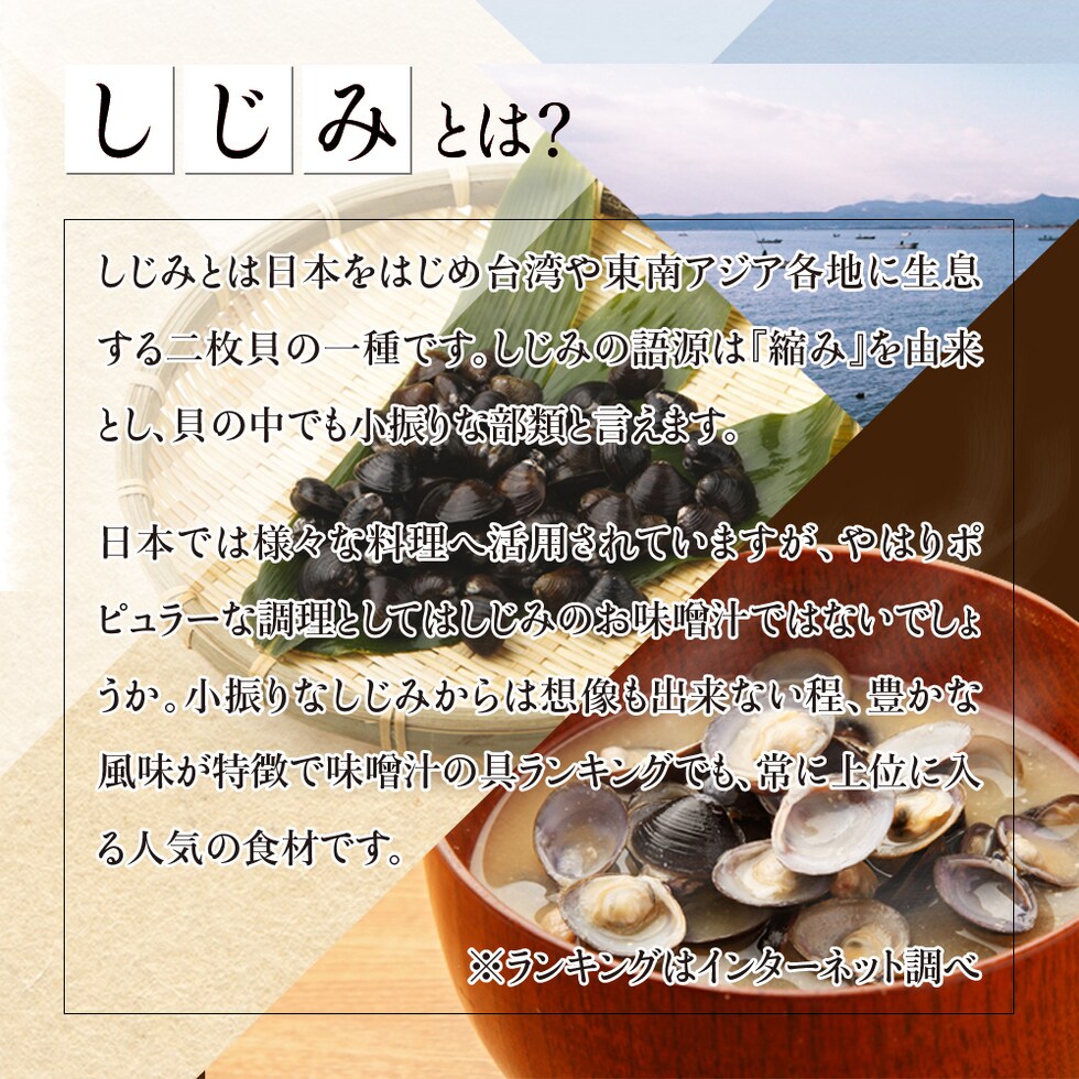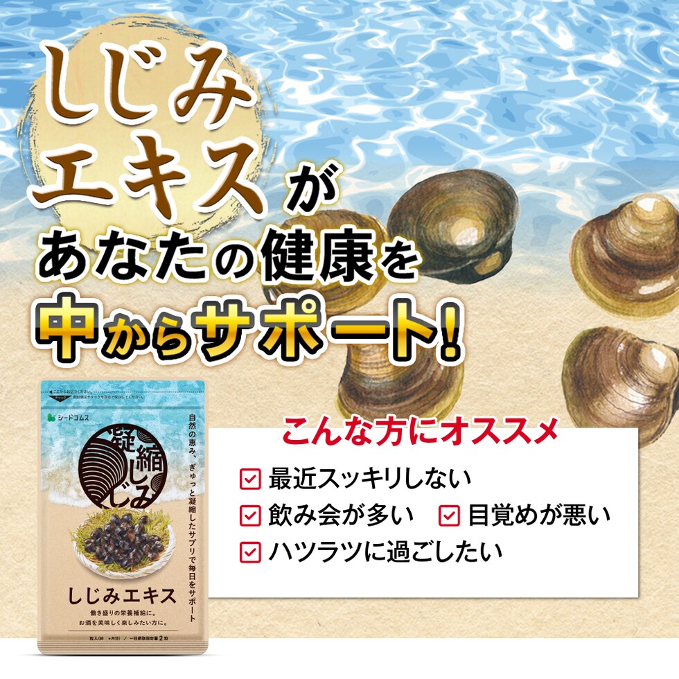 | 原材料 | シジミパウダー(デキストリン、シジミ、食塩)、デキストリン、カキガラ末/微結晶セルロース、ステアリン酸カルシウム、微粒二酸化ケイ素、調味料(アミノ酸等) |