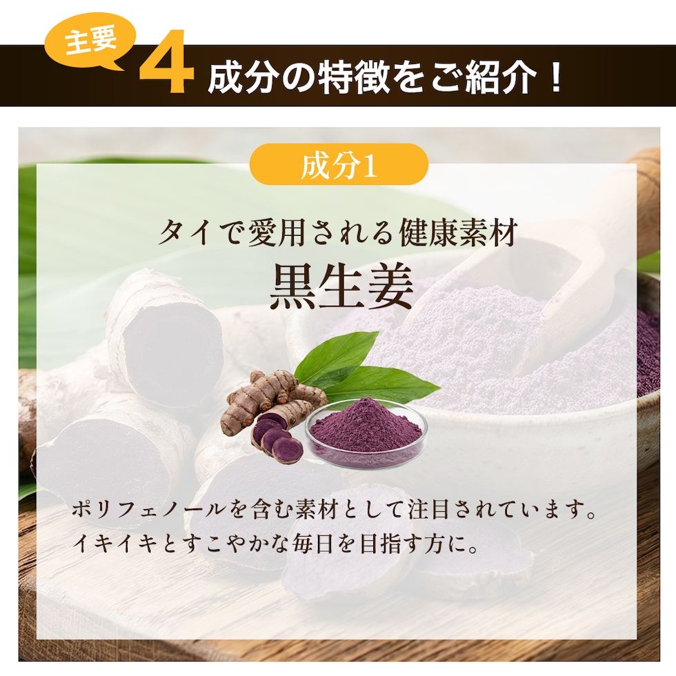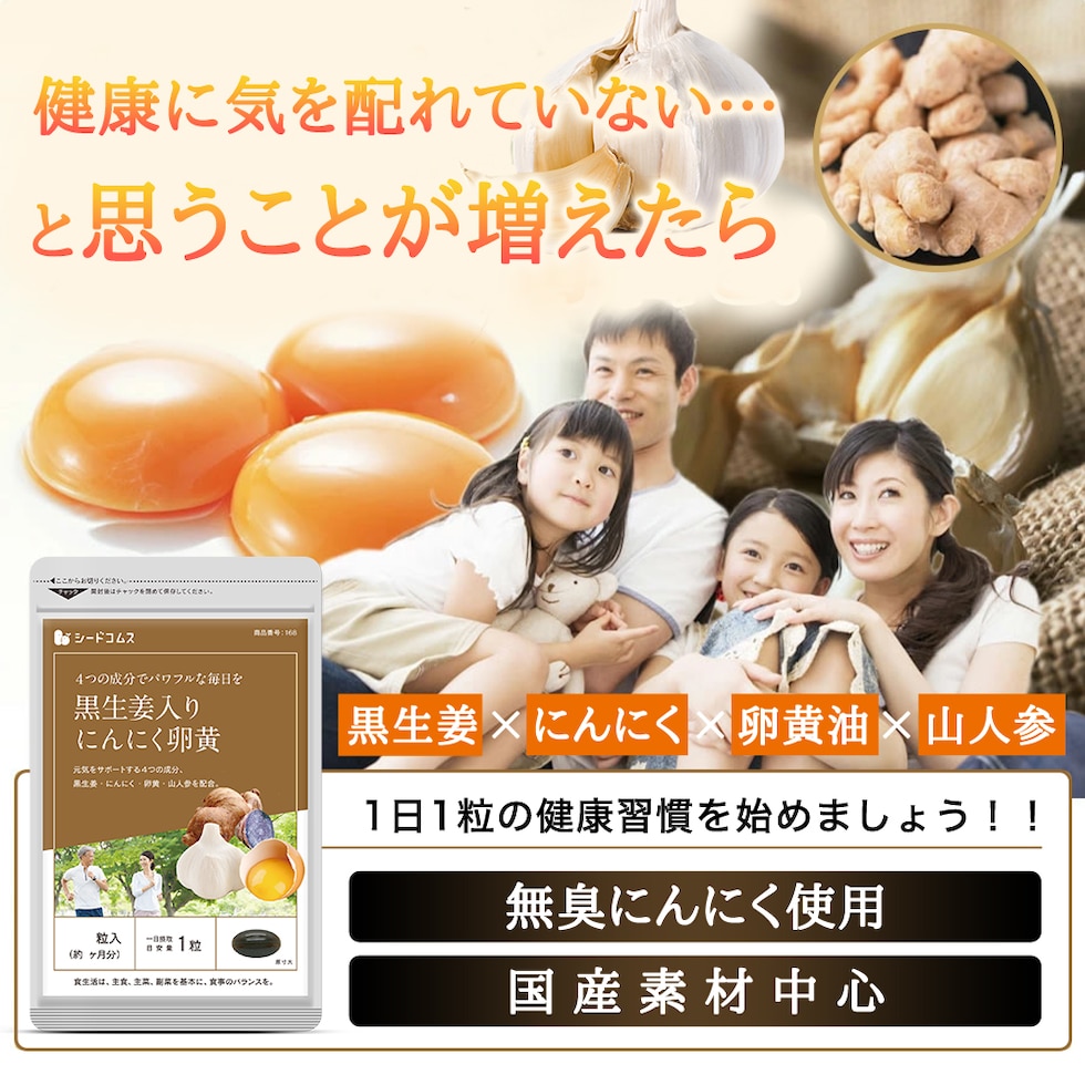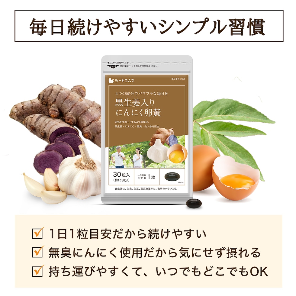 無臭ニンニクエキスパウダー…50mg、黒ショウガ粉末…30mg、山人参粉末…30mg、卵黄油…20mg |