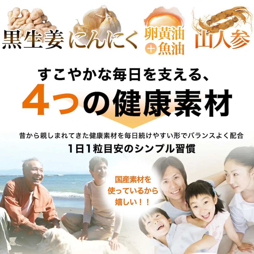 | 原材料 | DHA・EPA含有魚油、無臭ニンニクエキス末、日本山人参末、黒ショウガ末、卵黄油、ゼラチン、グリセリン、グリセリン脂肪酸エステル、ミツロウ |
