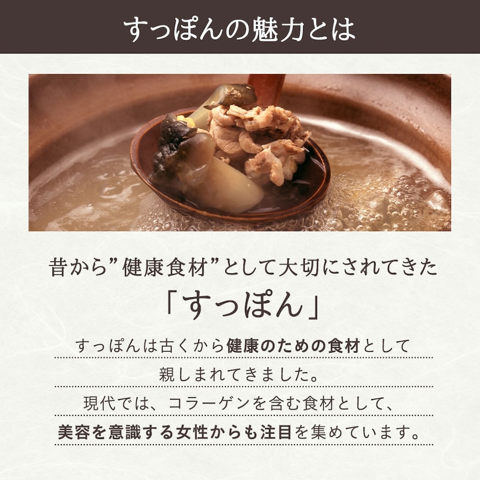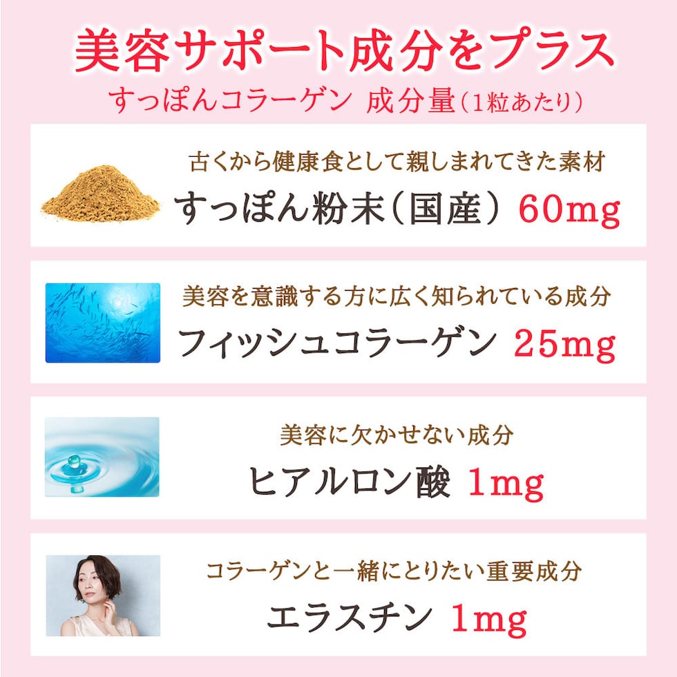 すっぽん末…60mg、フィッシュコラーゲン…25mg、ビタミンE…2.5mg、ヒアルロン酸…1mg、エラスチン加水分解物…1mg |