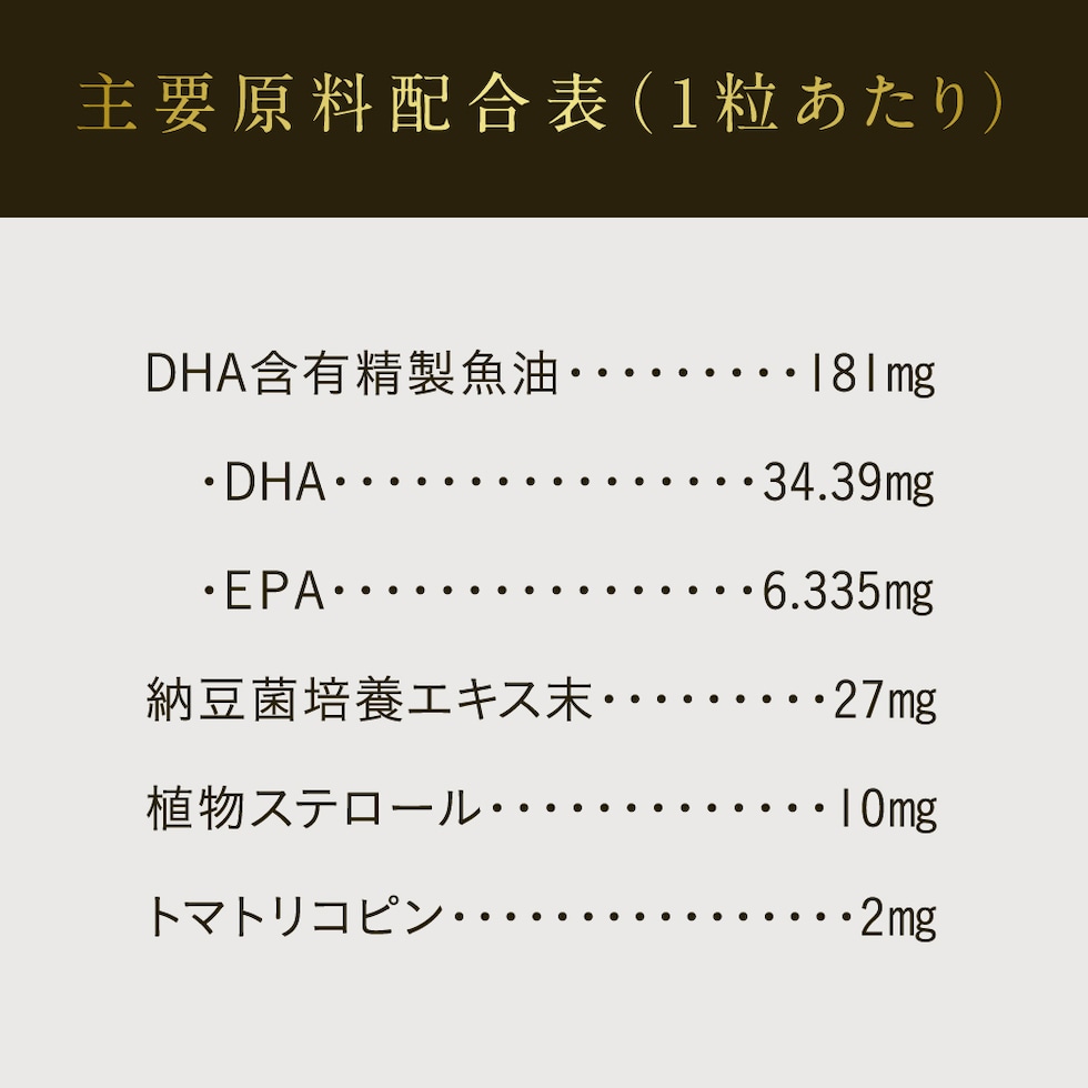 | 原材料 | DHA含有精製魚油(国内製造)、納豆菌培養エキス末(デキストリン、納豆菌培養抽出物(大豆を含む)/ゼラチン、グリセリン脂肪酸エステル、植物ステロール、トマトリコピン、酸化防止剤(V.E) |