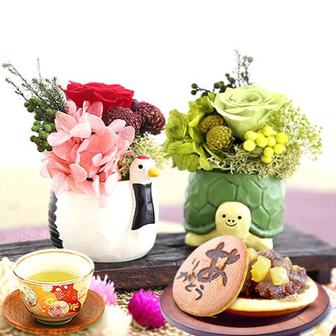 \数量限定!/ 誕生日 プレゼント お祝い 贈り物 ギフト お菓子 スイーツ プリザーブドフラワー 一寸つる&かめペア 和菓子セット issunC 送料無料 ※ご指定日にお届け