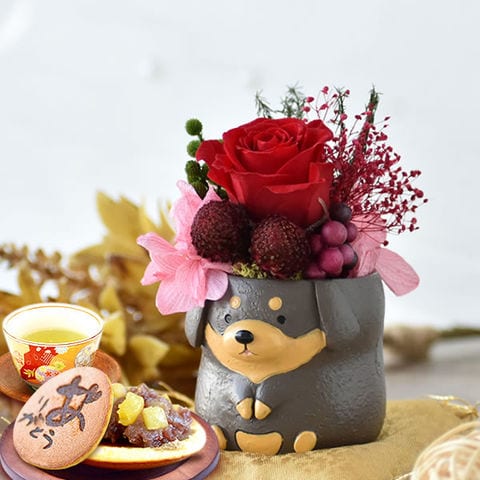 \数量限定!/ 誕生日 プレゼント 贈り物 お菓子 誕生日プレゼント 花 ギフト プリザーブドフラワー 一寸 ダックス【こげ茶】 和菓子セット issunA 送料無料 ※ご指定日にお届け