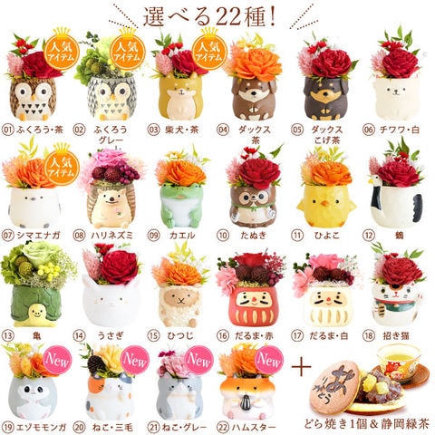 | 商品名(名称) | 選べるミニポット・プリザーブドフラワー&どら焼き1個セット |