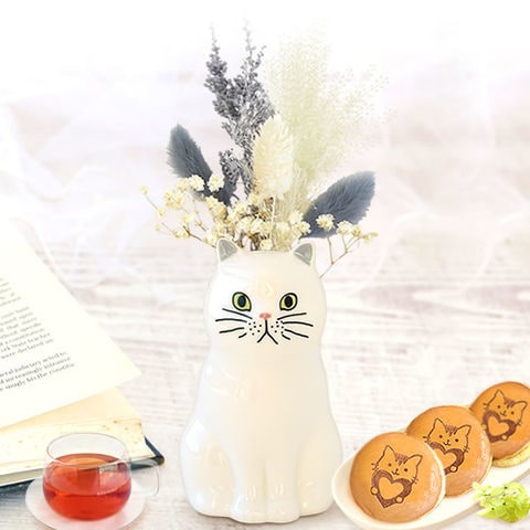 | 商品名 | ドライブーケ付き猫一輪挿し陶器+ネコ柄お芋チョコどら焼き3個セット |
