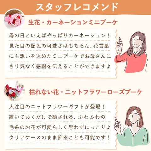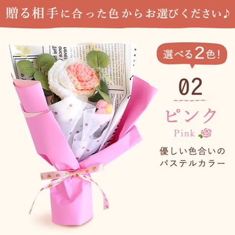 | 商品名 | 選べる フラワーブーケギフト +スイーツセット 1. 【生花】カーネーションミニブーケ 2. 【枯れない花】ニットフラワーローズブーケ |