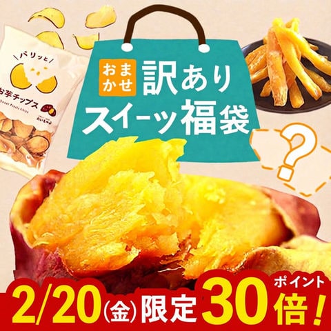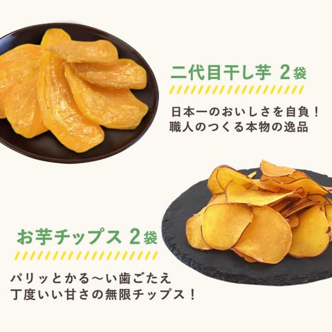 | 内容量 | ◎焼き芋(やきいも) 4袋 内容量 1袋あたり150g以上 小さいサイズは2本入りになります ◎二代目干し芋(お粉タイプ) 2袋 内容量 1袋あたり130g ◎おいもチップス 2袋 内容量 1袋あたり200g |