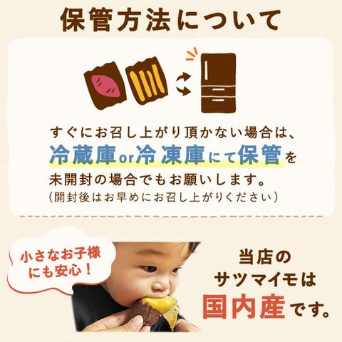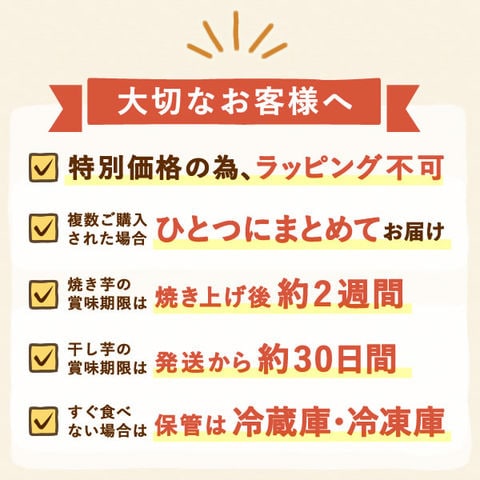 ●干し芋 発送から約30日※パッケージ記載 開封後2、3日以内 ●焼き芋 焼き上げから2週間 到着後は冷蔵庫、冷凍庫で要保管。冷凍の場合は召し上がる前に自然解凍をお願い致します。 ※賞味期限は同時発送の商品でも、日付の異なる場合がございます。ご了承くださいませ。 |