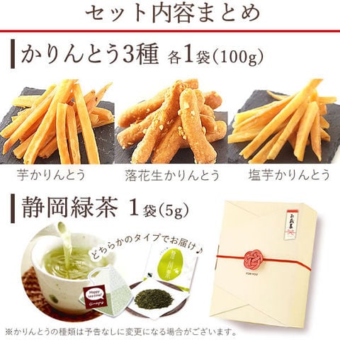 | 賞味期限 | かりんとう:製造から3ヵ月 静岡緑茶:製造から1年 (※パッケージ記載) |