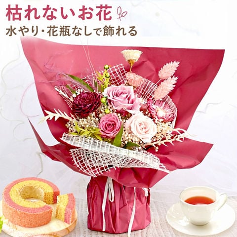 ≪単品≫ ● 3色から選べる プリザーブドフラワーブーケ【1個】 ※専用の手提げ袋付き ≪スイーツ付き≫ ● 3色から選べる プリザーブドフラワーブーケ【1個】 ※専用の手提げ袋付き ●苺とサツマイモのバウムクーヘン 【1個】 発送日から常温で約20日間 卵(国産)、砂糖、ショートニング、マーガリン、小麦粉、乳等を主要原料とする食品、さつまいも、バター、苺果汁加工品、アーモンド加工品、さつまいもペースト、植物油脂、洋酒/加工澱粉、トレハロース、乳化剤、膨張剤、ソルビトール、香料、着色料(コチニール、ラック、カロチン)、酸味料、(一部に卵・小麦・乳成分・アーモンド・大豆を含む) 【静岡紅茶(2g) 1袋】 賞味期限:製造から約1年(未開封時)※パッケージ記載 原材料:緑茶(牧之原市) 【発送の温度帯】 常温便にてお届け |