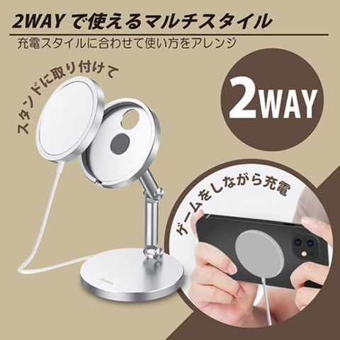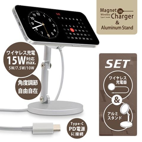 マグネット内蔵ワイヤレス充電器と角度調節自在のアルミスタンドセット。