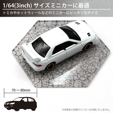 1/64ミニカーに対応トミカやホットウィール、マジョレット、GREENLiGHTなどのスケールにぴったりのサイズ(約80×92mm)。