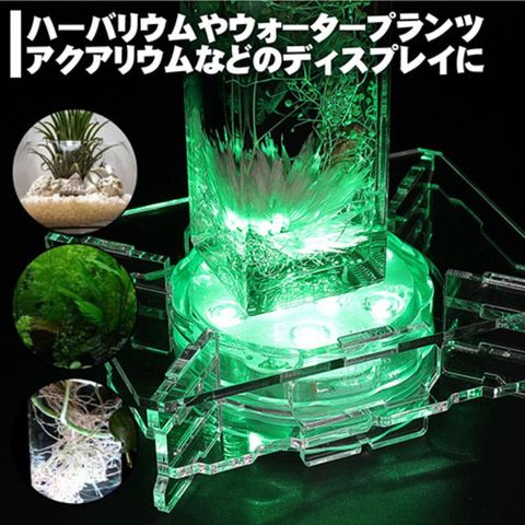 下方向からライトを照らすライトアップなら、人気のハーバリウムやウォータープランツ、イヤリングやネックレスなどのアクセサリー類なども載せるだけで美しいインテリアに変身!
