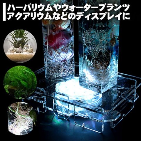 下方向からライトを照らすライトアップなら、人気のハーバリウムやウォータープランツ、イヤリングやネックレスなどのアクセサリー類なども載せるだけで美しいインテリアに変身!