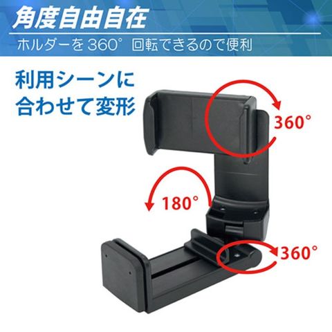 2軸方向に調整できるヒンジと回転式ホルダーを備えており、スマートフォンをお好みの方向に向けることができます。