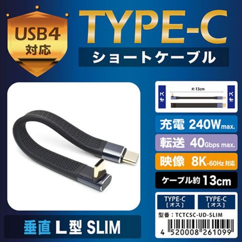 USB4対応ショートタイプTYPE-CtoTYPE-Cケーブル L字(垂直SLIM)。