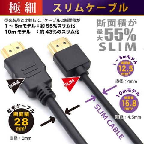 スリム設計のケーブル : ケーブルの直径は約4.5mmとなり、従来ケーブル(約6mm)と比較して、断面積で最大55%スリム化されました。