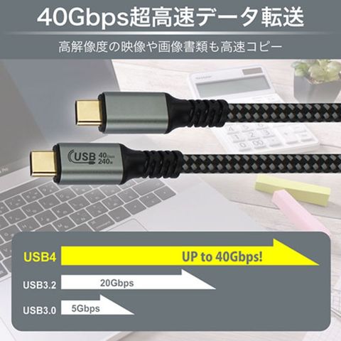 本製品は最大40Gbpsまでのデータ転送に対応しており、パソコンと接続した外部ドライブ(SSDやHDD)等との大容量データ転送にご利用いただけます。
