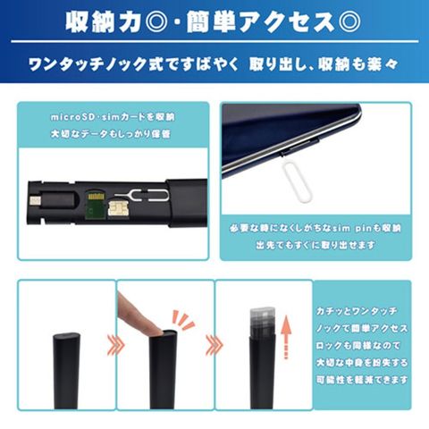 SIMピン、SIMカード収納スペース、microSDカード収納スペースを内蔵しており、旅行や出張時にも便利です。