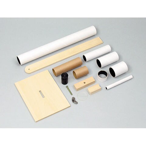 対物レンズ(φ34mm、PmmA製)×1、接眼レンズ(スリープ径:φ21.5×38mm)×1、本体(紙管)×8、ファインダー接続パーツ(木製)×1、三脚パーツ(木製)×3、蝶ナット×1、六角ボルト×1、工作ボンド(10g)×1