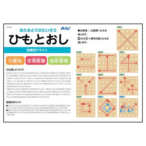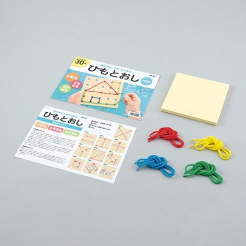 ●セット内容 : ひもとおし用ボード×1、ひも×4(4色 : 赤・青・黄・緑)、問題集×1、説明書兼指導者用テキスト×1