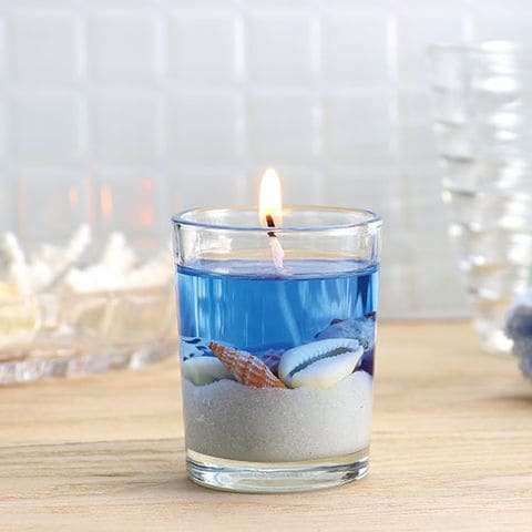 セット内容 : キャンドル容器×1、キャンドル芯×1、ゼリーキャンドル青×1、ミックスシェル10g×1、白砂40g×1